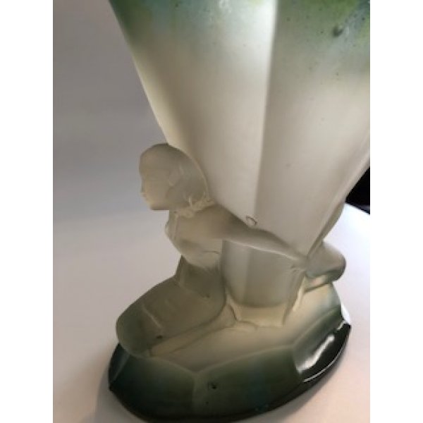 Középen a tejüveg átmenetes zöld színbe megy át a talpán és a váza szájánál