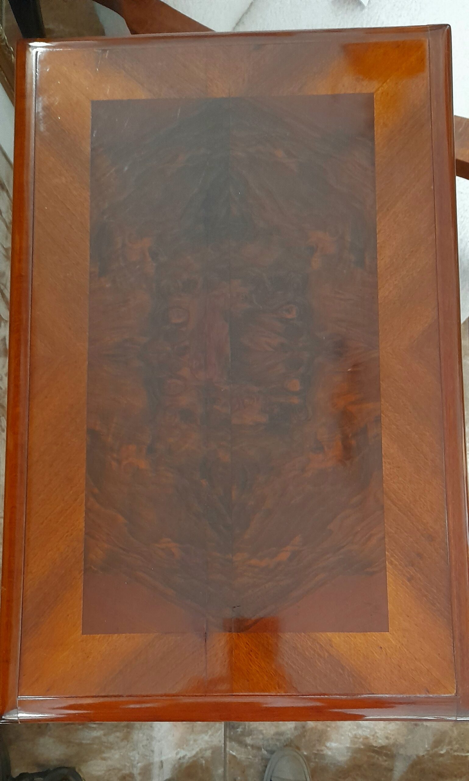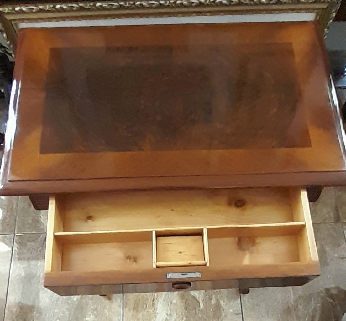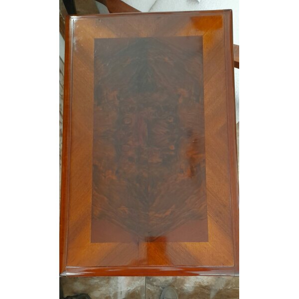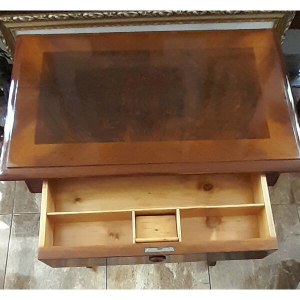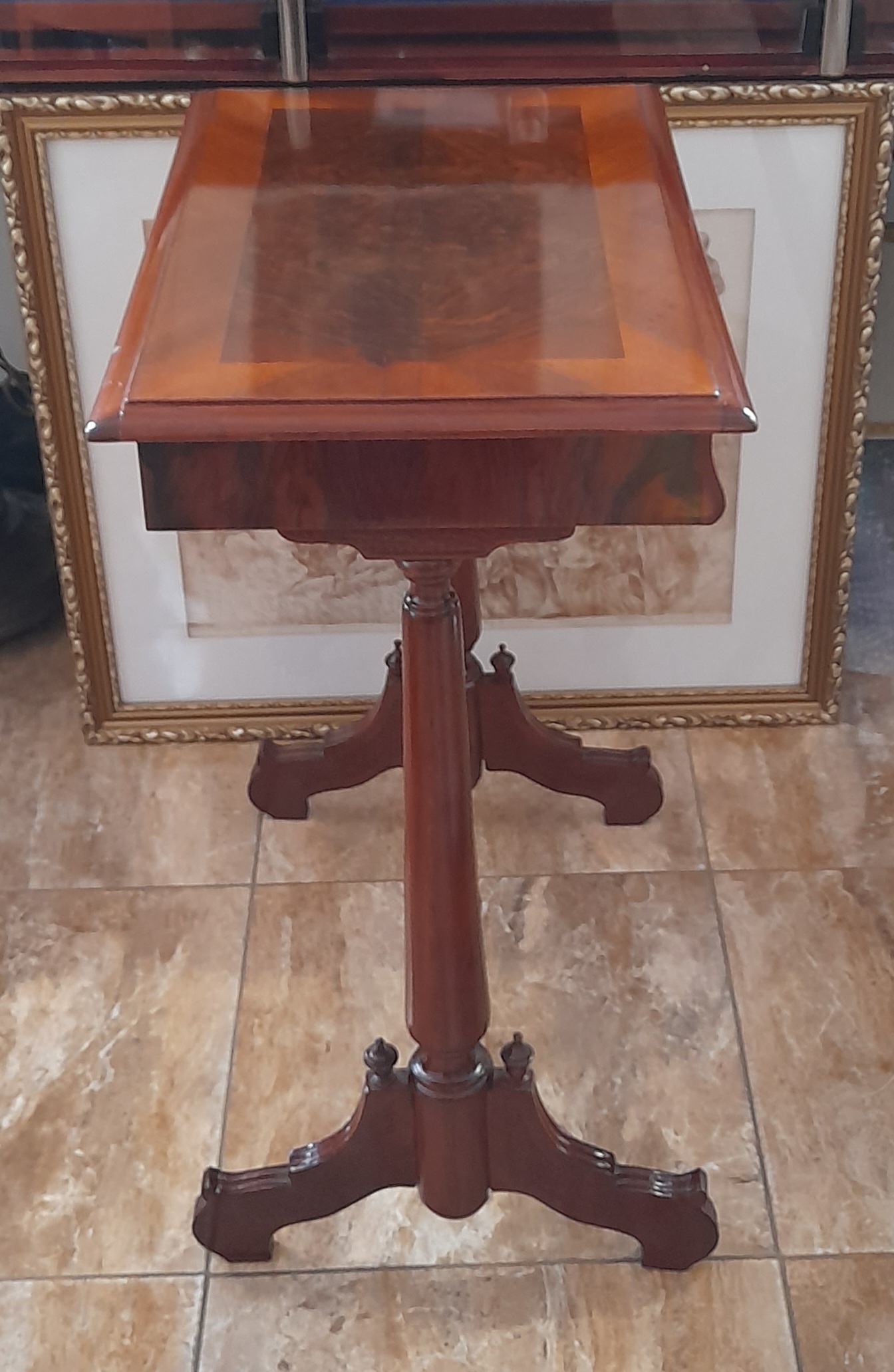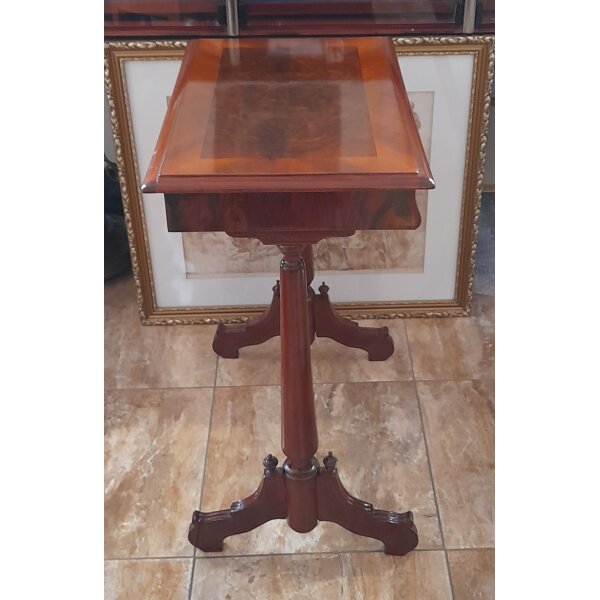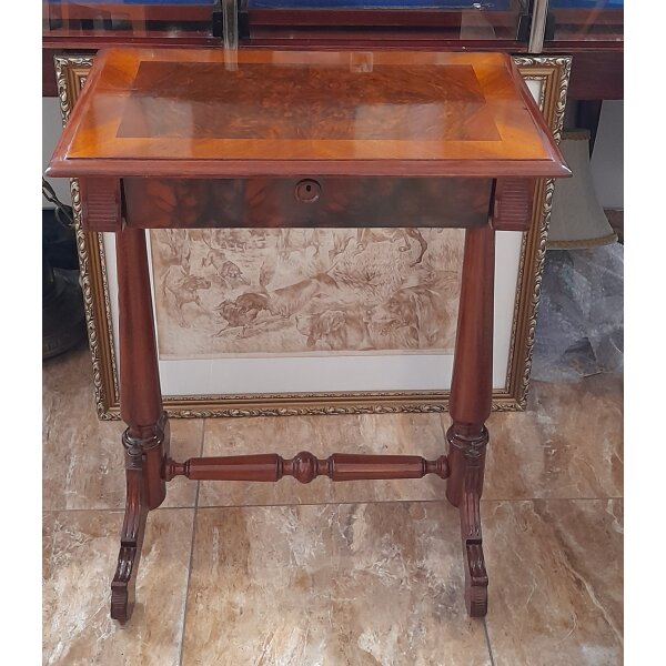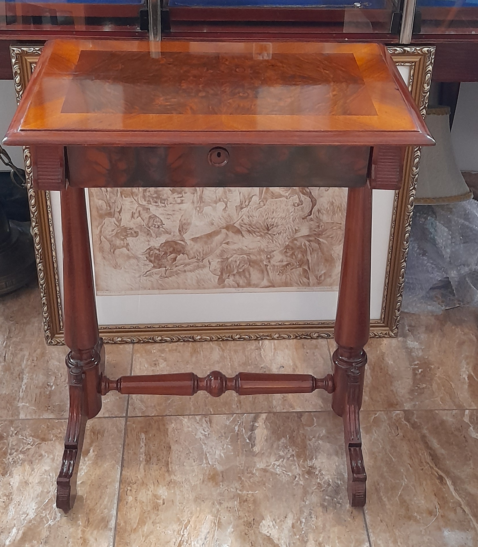 Biedermeier varróasztalka. Fa, erezetes, politúrozott. Kihúzható fiókja rekeszekre osztott. Felújított állapotban. 20. sz. eleje