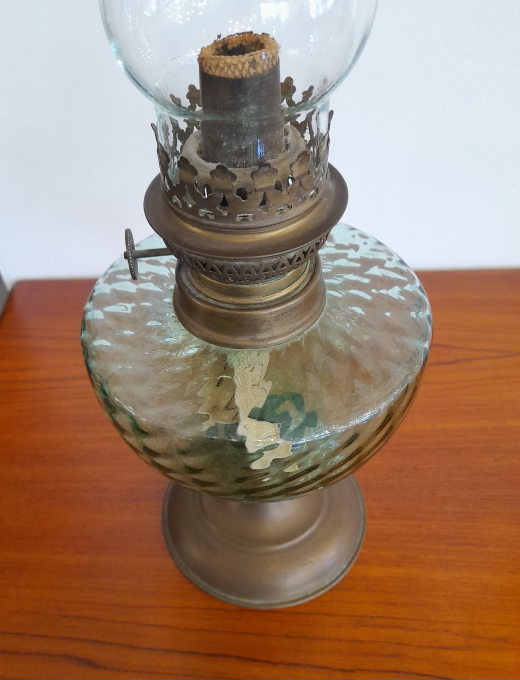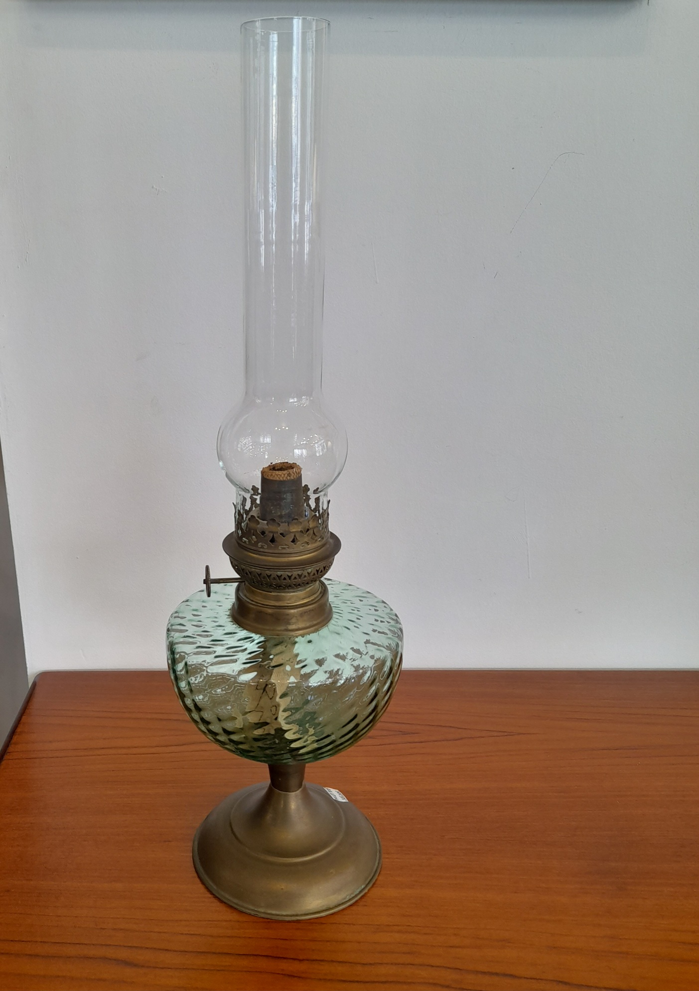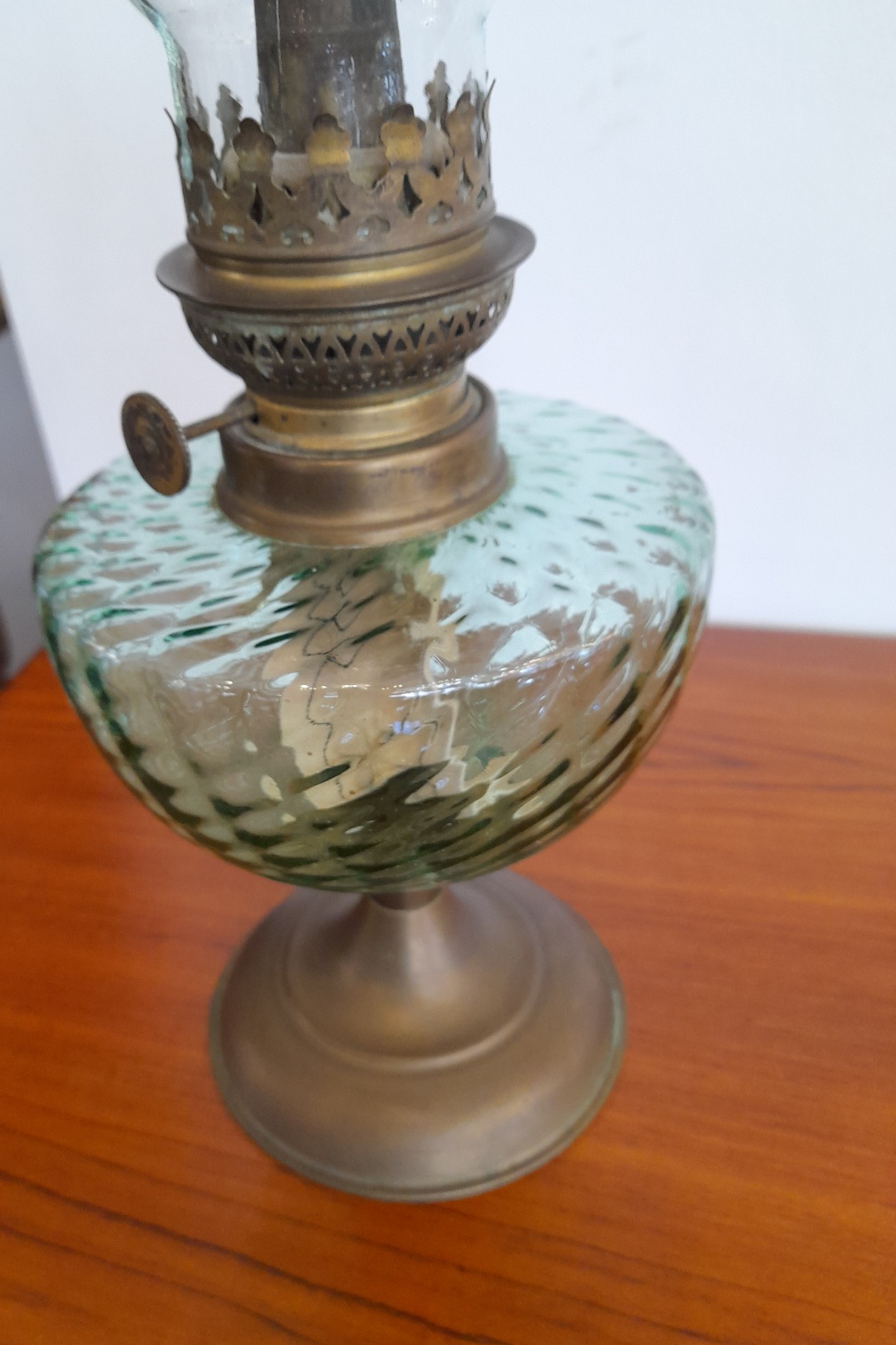 Francia petróleum lámpa mintás, zöld üvegtesttel
