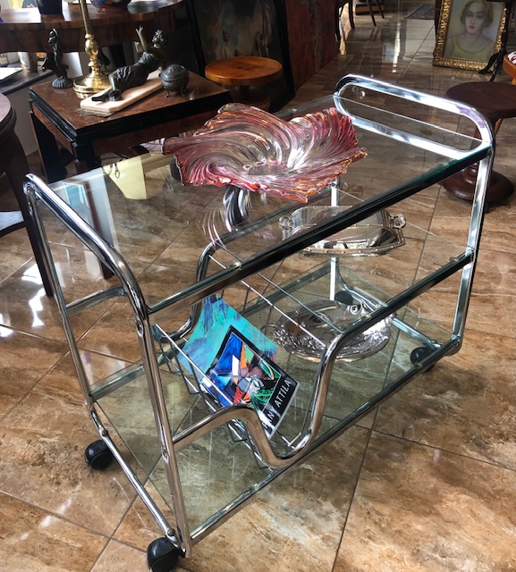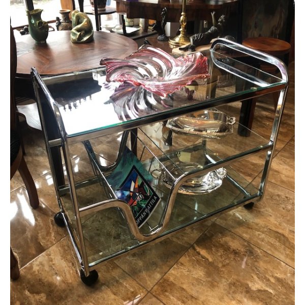 Zsúrkocsi retro. Króm keret, 3 üvegpolc újságtartóval. Korának megfelelő állapotú. 1970-es évek